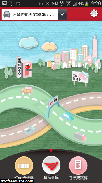 遠通電收ETC - 官方通行費查詢程式,可以新增多筆車藉資料,查詢台灣高速公路ETC電子收費帳戶餘額,以及三天內的應繳通行費(待扣繳或待繳),還提供銀行帳戶儲值、計程通行費試算等服務,未來還計畫提供eTag卡條碼功能。(阿榮)(下載)